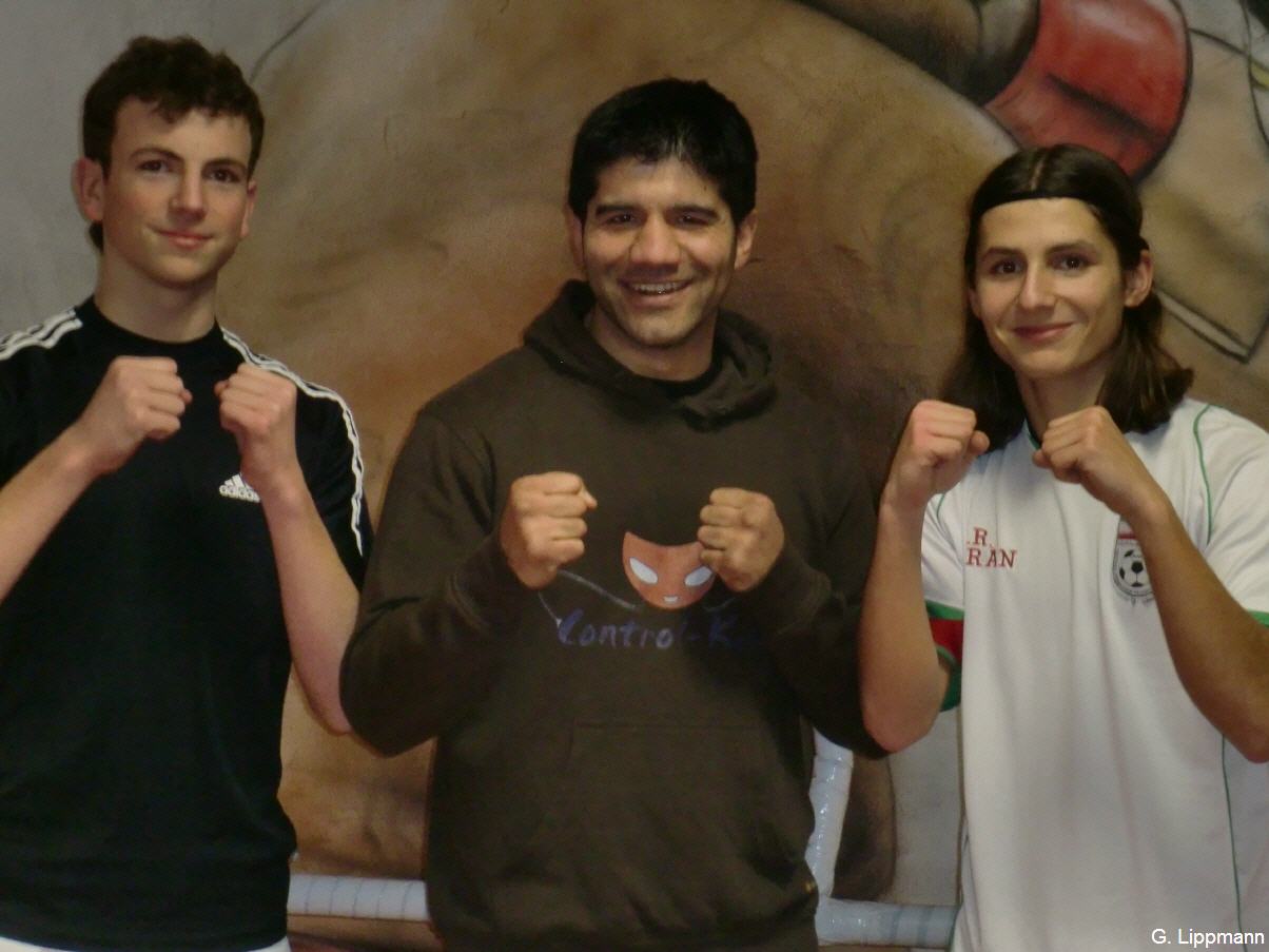 Bild: Mannschaftsführer Sebastian Erhard, Mohammad Rasuli (Boxtrainer), stellvertr. Mannschaftsführer Jubin Ansari
